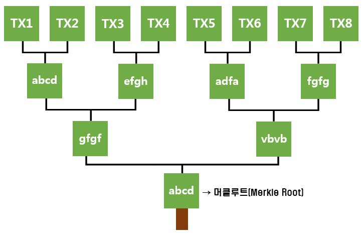 블록들의 필수요소이고 데이터들을 해시화해서 더한후 해시화를 반복해서 트리처럼 뻗어 마지막 루트 해시값을 구한다.