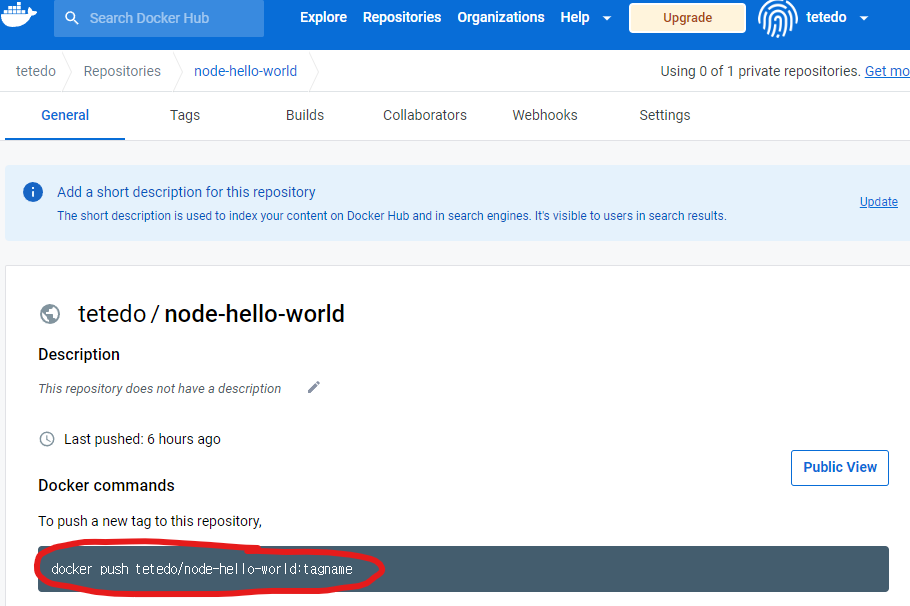 이미지의 이름은 태그네임을 빼고 복사한다. (tetedo/node-hello-world)