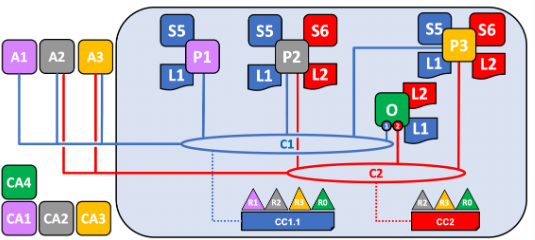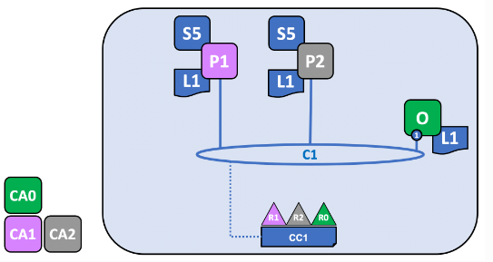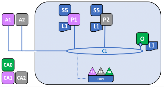 R1의 피어인 P1과 R2의 피어인 P2는 R0의 오더러 서비스인 O와 함께 채널에 가입한다.