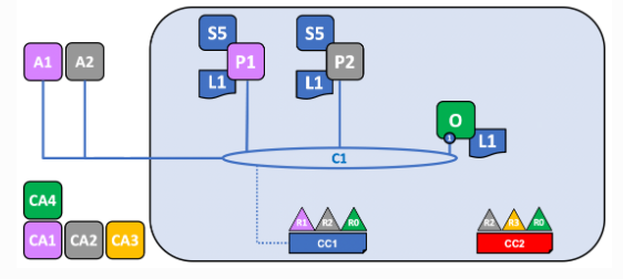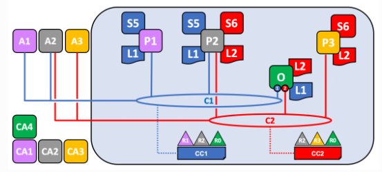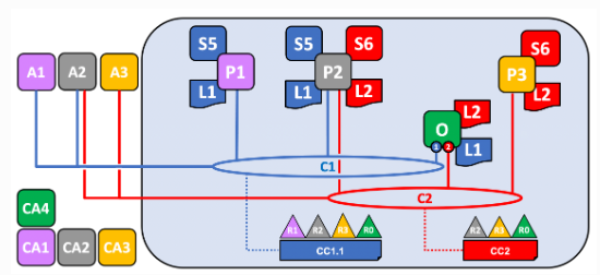 C1과 C2 모두 동일한 오더링 서비스 조직인 R0가 가입되어 있지만 서로 다른 오더러 노드가 각 채널에 서비스를 제공한다.