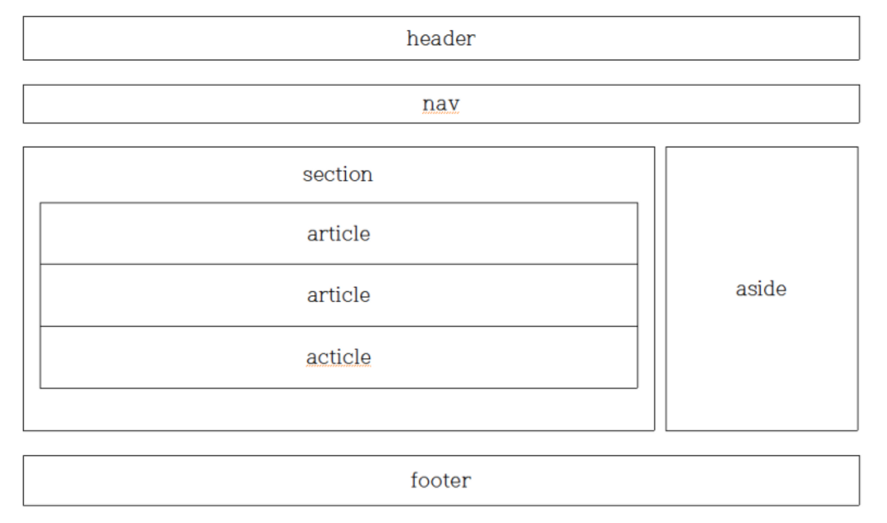 시맨틱태그는 HTML5부터 채택된 방식으로 하나의 웹사이트를 여러구역으로 나누어 작성하는 방식이다.