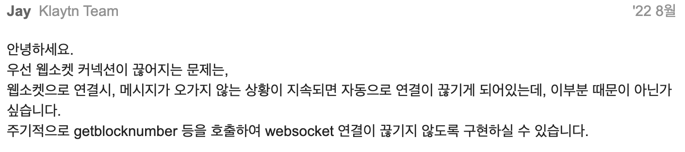 Klaytn에서 WebSocket을 연결하여 스마트컨트랙트에서 발생하는 이벤트를 구독하려고 했다.