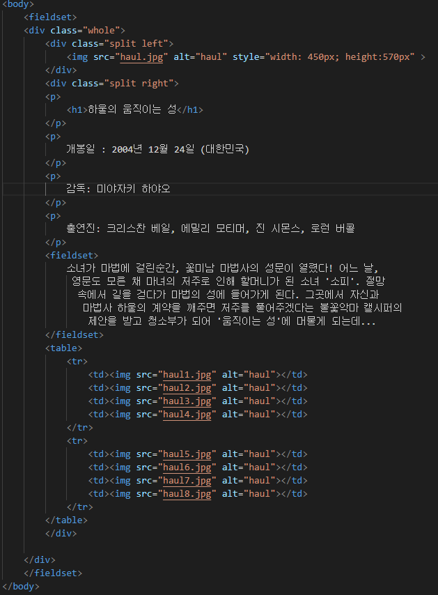 오른쪽  줄거리는 fieldset으로 처리했고 그 아래 사진들은 table을 이용하여 2행4열로 사진을 각각 넣어주었다.